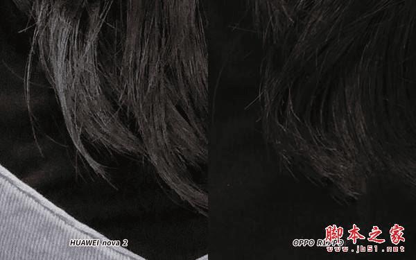 将室内样张放大,又会展现出两款手机在细节上的差异。左边HUAWEI nova 2拍摄的发丝更加细腻真实,而右边的OPPO R11则有涂抹感,回头看大图,OPPO要的可能是洗发水广告中那种柔顺光泽的效果。至于真实还是渲染,就看个人口味了。