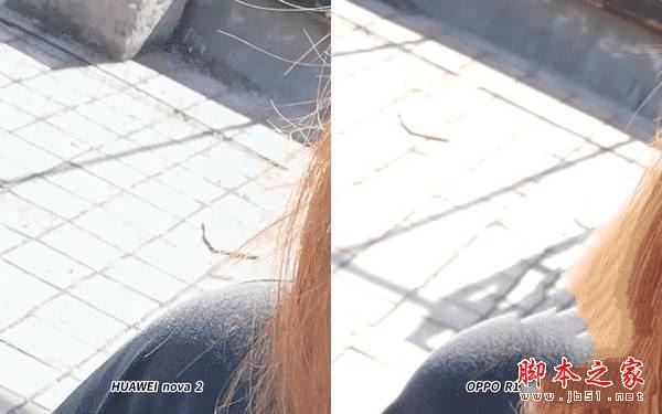 放大画面左上角,HUAWEI nova 2相比OPPO R11保留了更多的细节,地上的砖缝还能看清楚。