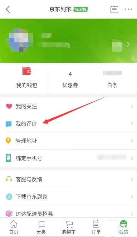 6、最后,来看下订单的评价记录是否能删除。如下截图所示,返回京东到家首页,点下方的导航“我的”,进入个人主页,在“我的评价”分栏里可看到当前帐号的评价记录,但截至2017年6月份是没有删除功能的,或许官方会添加此项功能吧。