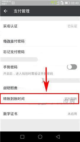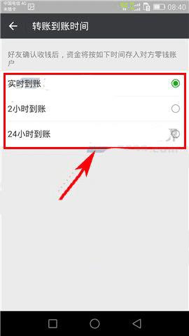 3)紧接着点击【转账到账时间】,最后选择自己所想设置的相应到账时间即可。(如下图)