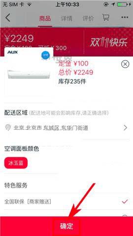 2)接着查看好商品详情信息后点击右下方的【立即付定金】按钮,随后选择好商品的款式、颜色等,点击【确定】;(如下图)
