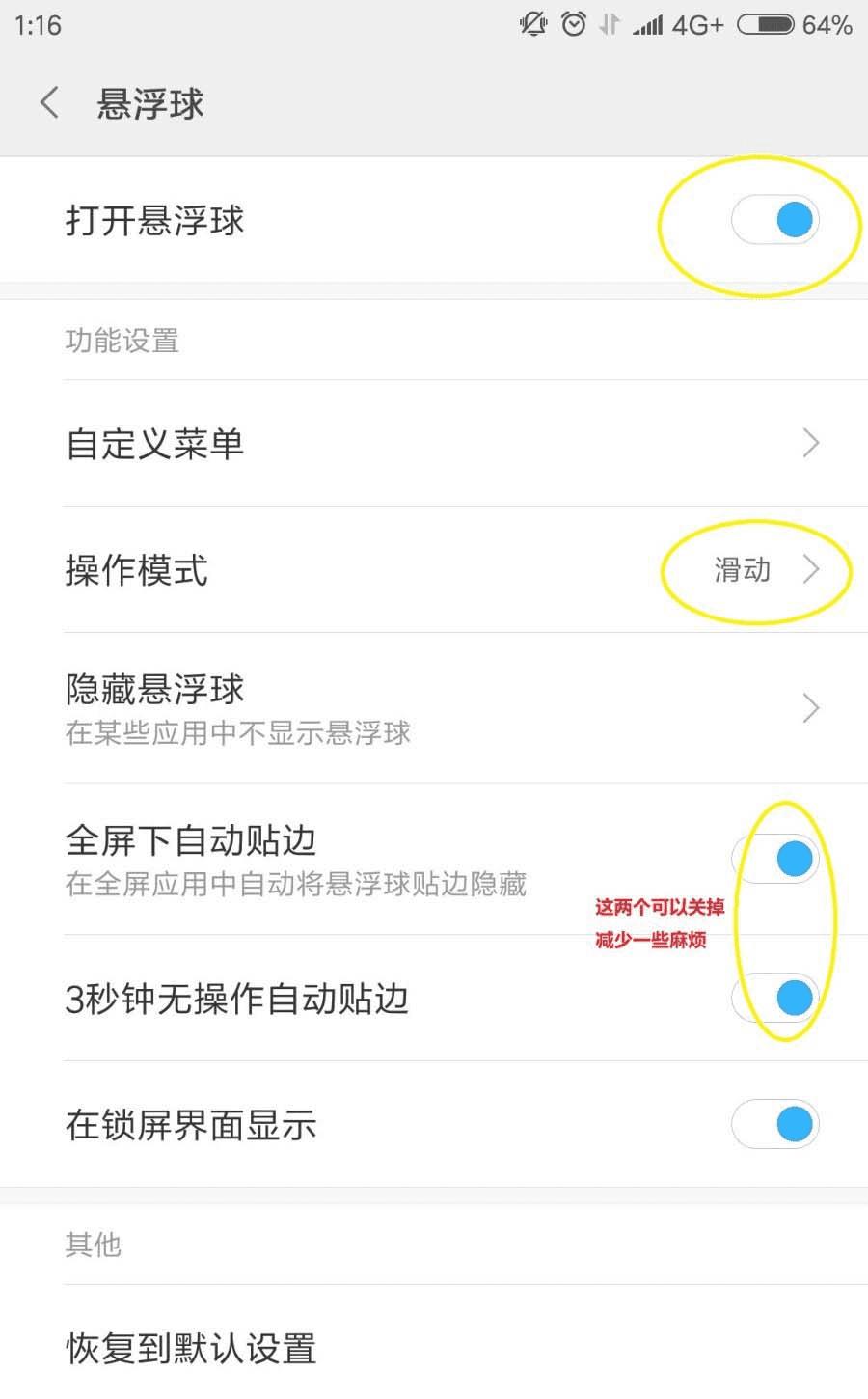 3、悬浮球共有五个功能朝五个不同的方向拖到实现五种功能。所以设置下拖最不容易出错。