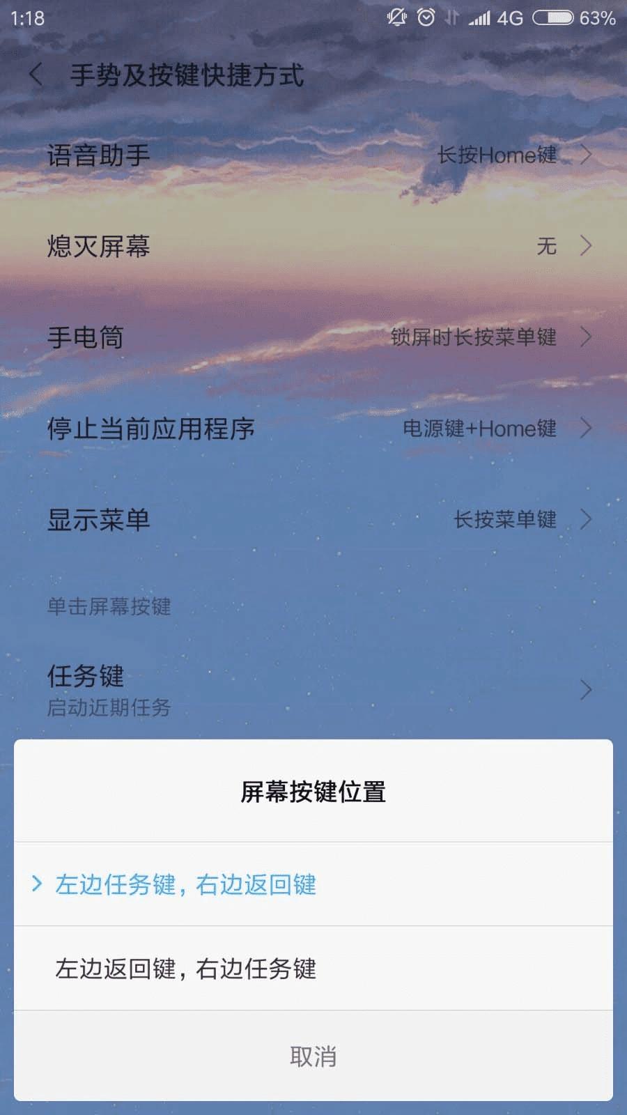 1、可以选择我们舒服的位置,在更多设置里的手势及按键快捷方式里,点击屏幕按键设置即可。