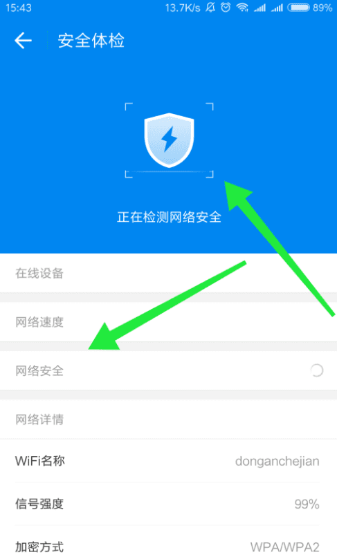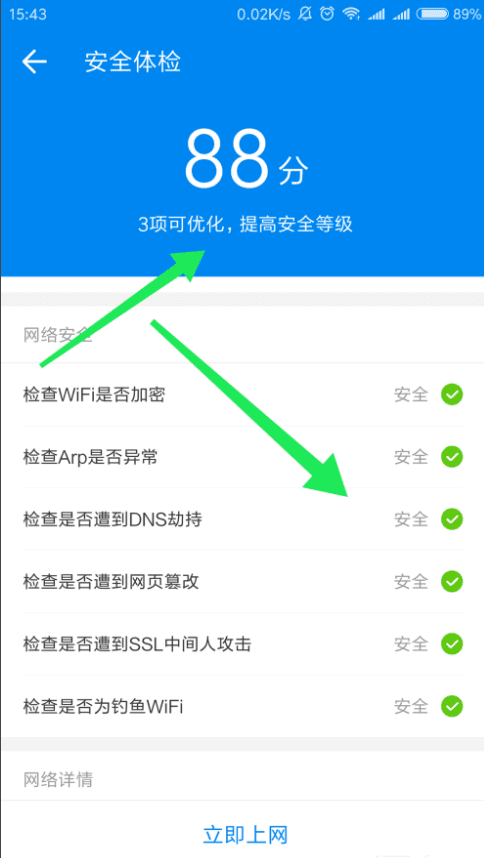 5、体检完成之后,我们就可以看到我们所连接的无线信号的安全性,会有一个分数,分数越高,代表无线信号越安全。