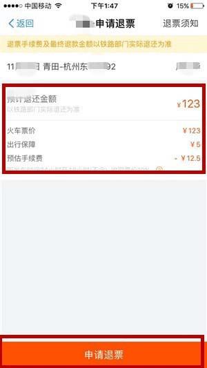 7、页面跳转后,我们确认好信息和预估手续费,无异议后,点击“申请退票”。