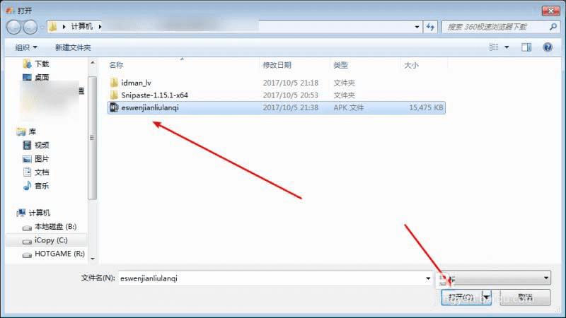 下载es,选择我的应用,点击模拟器的安装文件选项,然后选择apk文件打开即可,软件会自动安装的。或者双击下载的apk文件同样可以不通过模拟器安装。