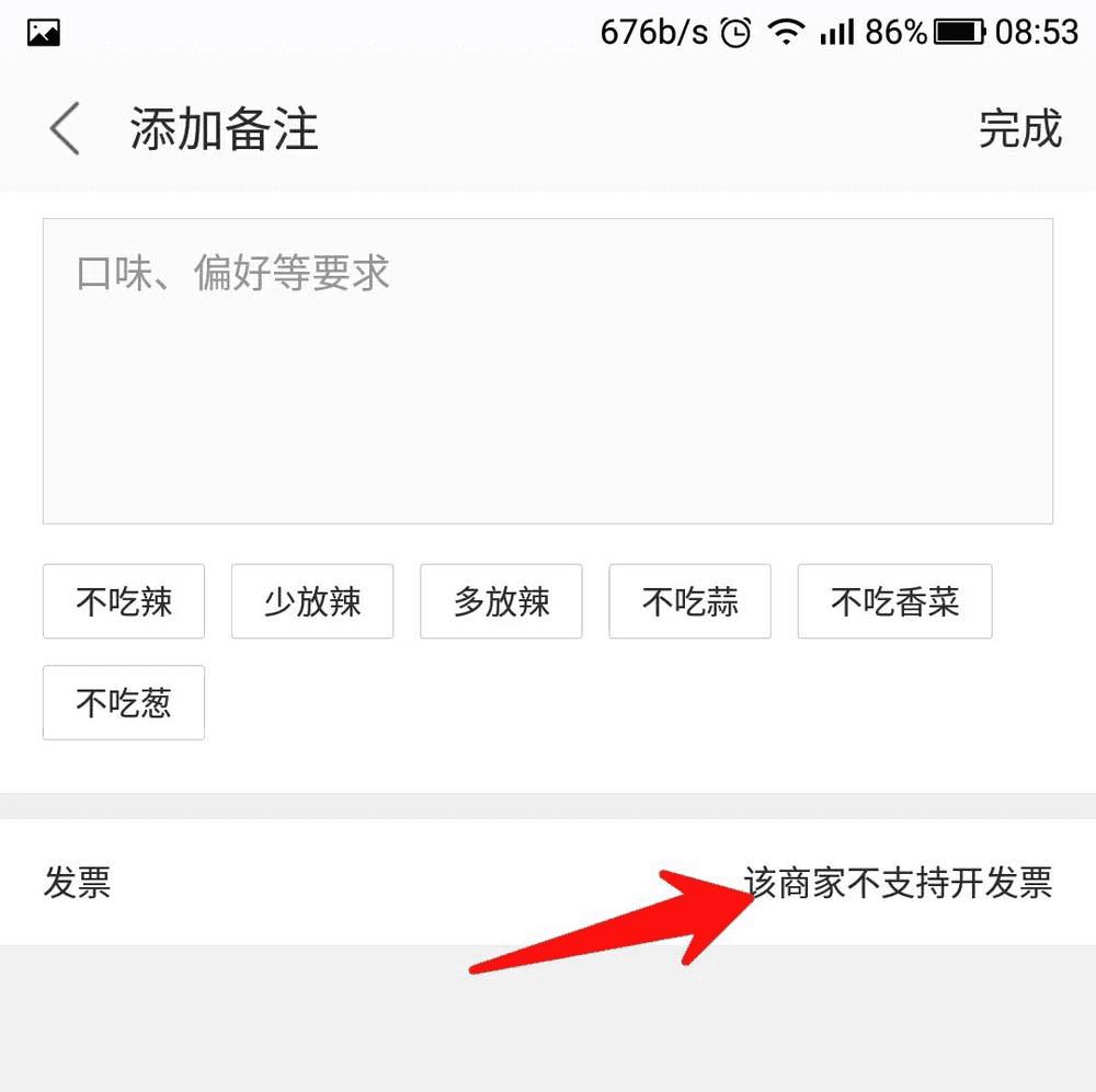 4、这里要注意,有的店是不支持开具发票的,如果不支持开发票,在图示发票位置将会显示,本店不支持发票,那就换家店吧!