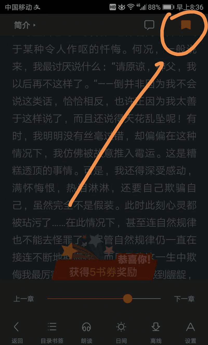 6、进入正文界面后点按箭头指向的目录书签标志,如下图所示,如果不显示目录书签标志,可以点一下正文界面,之后目录书签标志就可以显示了。