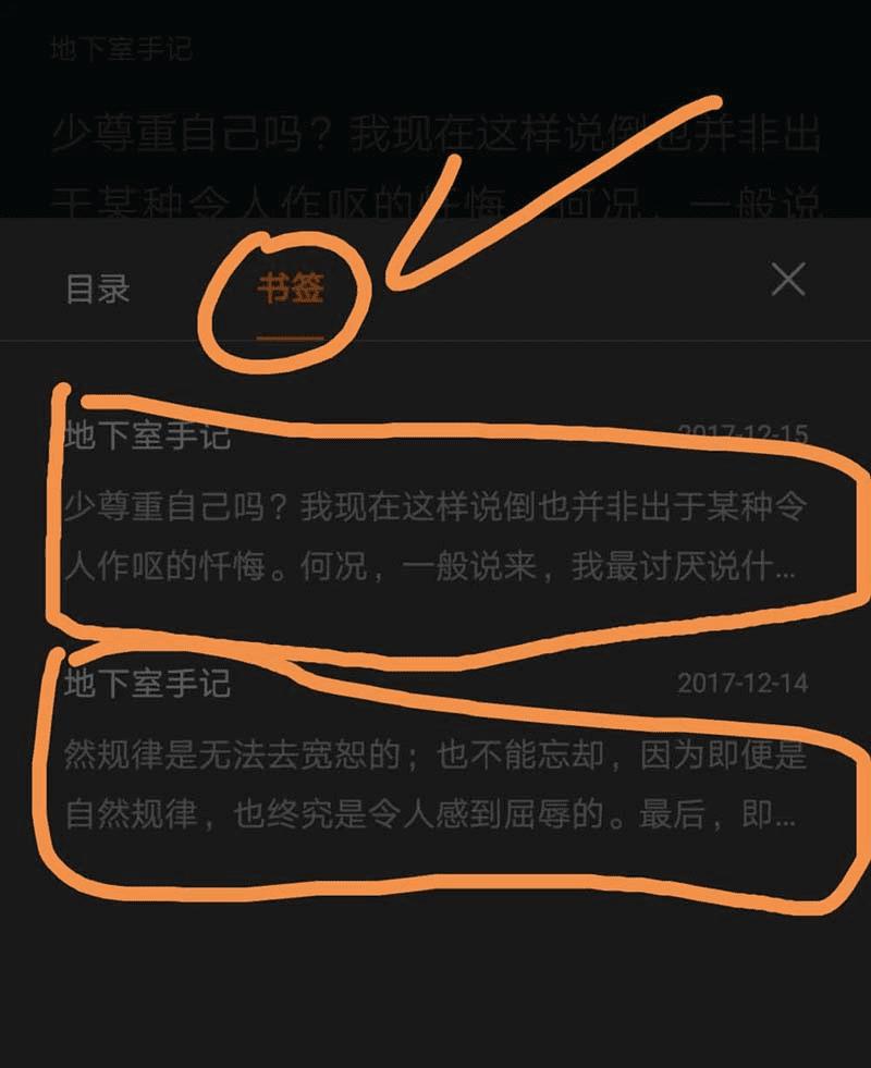 7、进入书签界面可以看到界面中箭头指向的被圈起来的部分就是书签,点按进入就可以转入书签对应的页面。