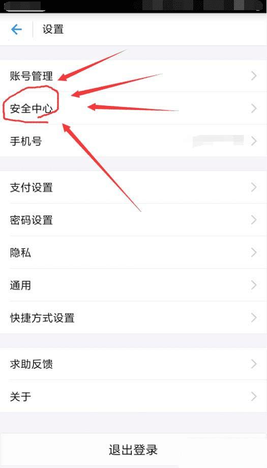 2、在弹出的设置界面,如下图红色箭头所指,找到“安全中心”的功能项,点击进入该功能项,进入安全中心设置页面