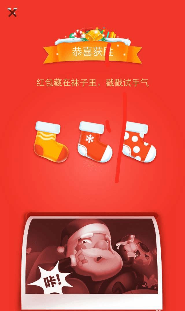 6、点中三次后,会出现三个圣诞袜子的界面,随机选一个。如果没有红包,就会出现一些优惠券。