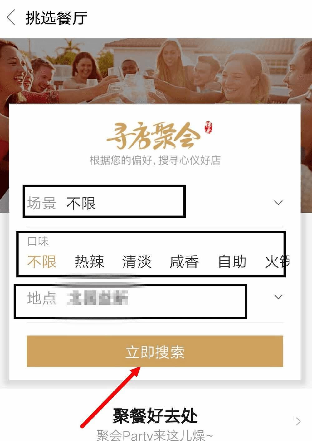 3、我们再如下界面里面挑选餐厅,填好场景、地址、喜好餐品,点击下方的立即搜索,我们可以选择一个想要去的店去聚餐,如果没有合适的店铺还可以选择换一批接着挑眩