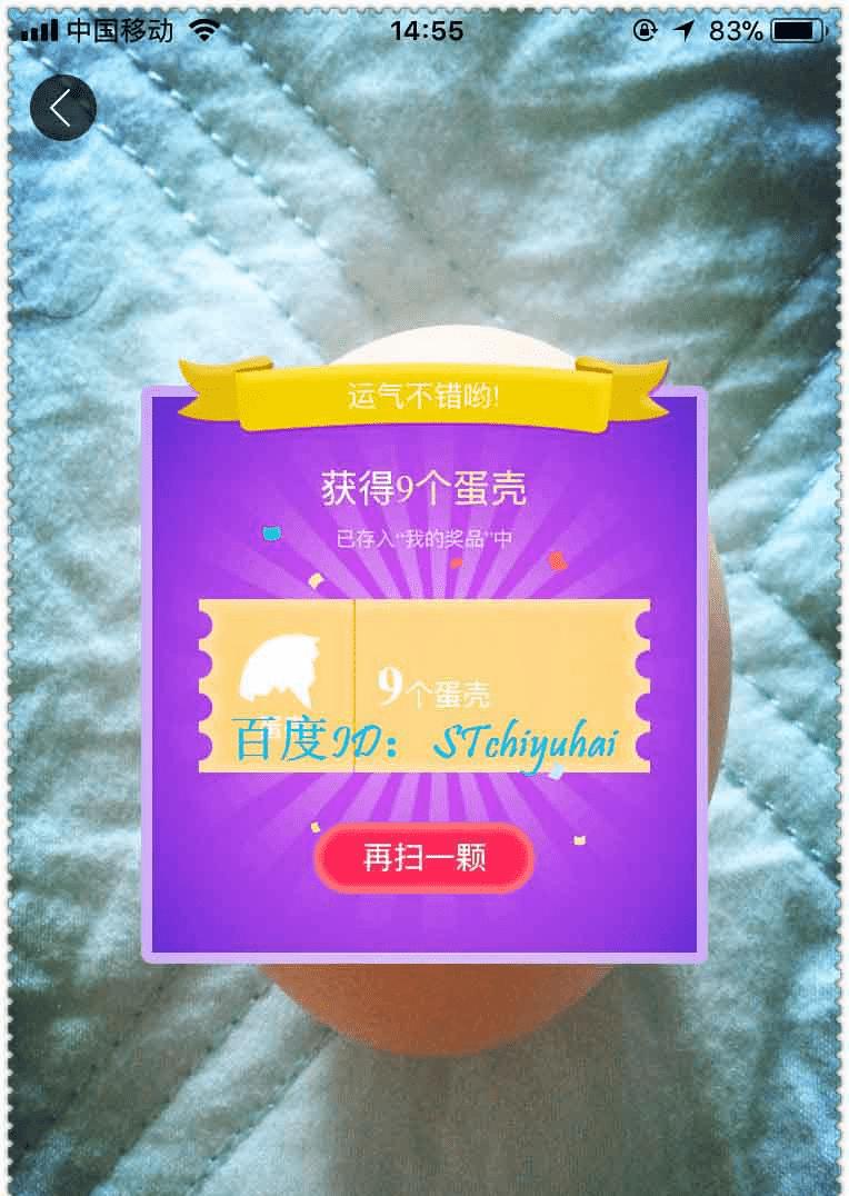 5、点击敲碎虚拟鸡蛋,可以弹出不同的优惠,有时候可能是空的,有时候给的是蛋壳碎片,蛋壳碎片累积到一定的数量,可以兑换不同的优惠。