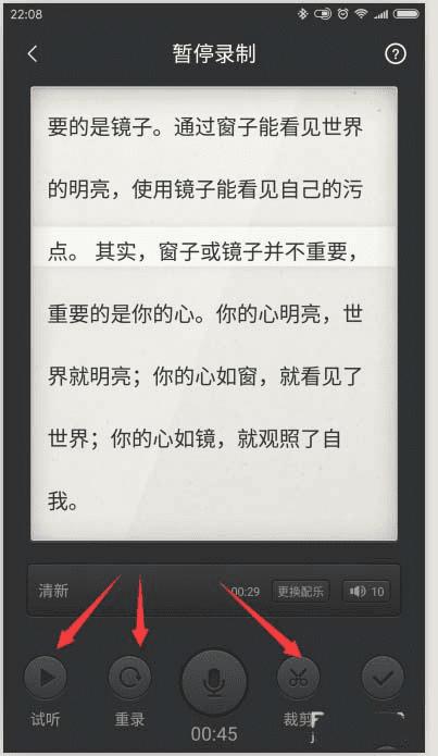 5、一般推荐使用耳机进行朗读,音质会更好。点击带话筒的按钮,就开始录音了,你就可以进行朗读了,朗读完成后,点击带话筒的按钮,就停止录音了。你可以先选择屏幕下方的试听,听一听自己朗读效果,如果不是很好,可以选择重录。也可以选择裁剪来编辑这段录音。