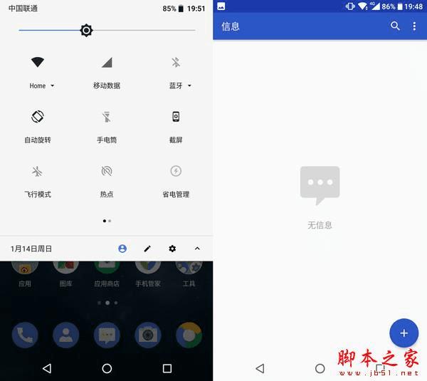 通知栏、手机设置、拨号界面,全部都严谨遵循谷歌定下的Material Design规范,如果是平时有用开国际版应用的用户就会感到十分熟悉,清新简洁的界面,配色鲜明具有活力,和许多界面元素繁杂的定制系统形成鲜明对比。