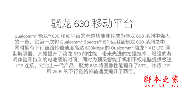骁龙630采用八核心架构,核心频率较上代的骁龙625处理器有小幅度的提升。集成Adreno 508和Spectra 160 ISP处理器,并加入对LPDDR 4双通道内存的支持,虽然参数没有大幅度的跃进,但各方面都有了不小进步。内置基带和骁龙660一样采用X12 LTE Modem,最高可以实现600Mbps的下行速率,而上行速率也达到了150Mbps。