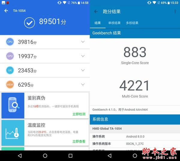 跑分方面,Nokia 6第二代在新版安兔兔中跑分89501分,处于主流机型水准。Geekbench单核运算883分;多核4221分,符合骁龙630的正常发挥。配合4GB运行内存,实际使用无论是玩日常操作还是玩网游都足够使用。