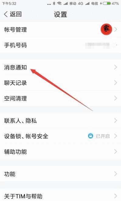 4、在打开的TIM设置页面中,点击“消息通知”菜单项。