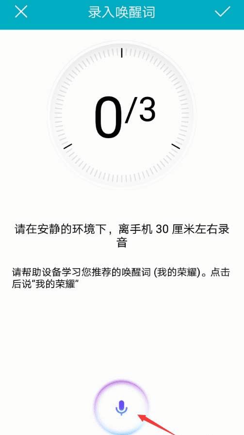 6、然后,会弹出录入唤醒词的界面,按着下方的录音键,将唤醒词说三遍,使手机录入你的声音;