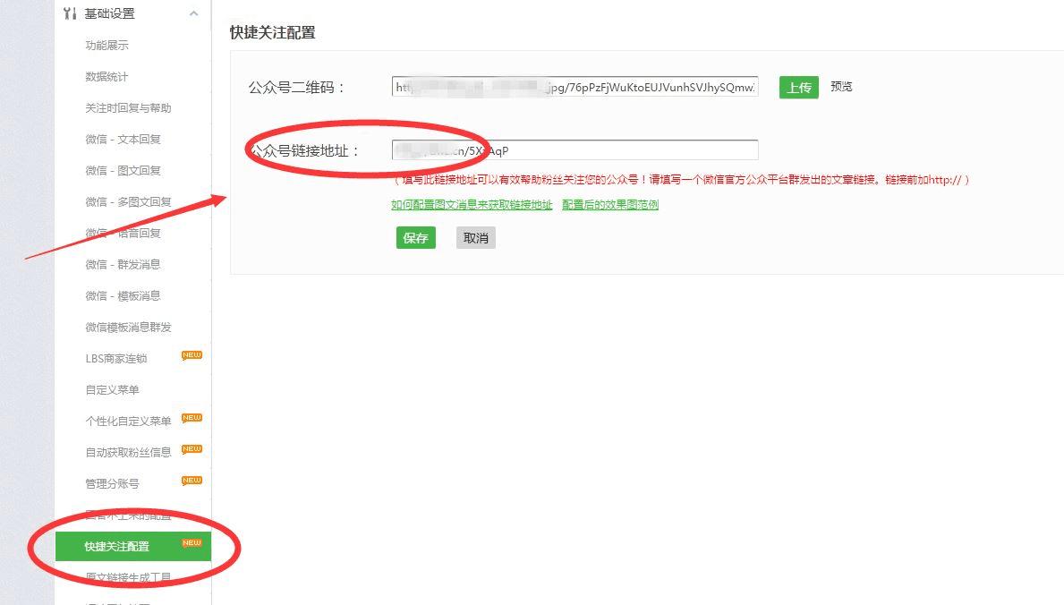 第二步,点击左侧自动获取粉丝信息,选择获取昵称头像,保存;然后点击左侧位置,快捷关注配置,把从公众平台复制来的关注链接填进去,保存