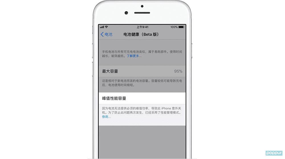 当电池最大容量在70%以下的时候,系统会自动启用性能管理功能(降频),此时会显示“因为电池无法提供必须的峰值功率,导致此 iPhone 意外关机。为了防止此问题再次发生,已经采用了性能管理模式。”