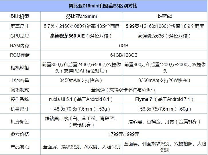 魅蓝E3和努比亚Z18mini区别对比