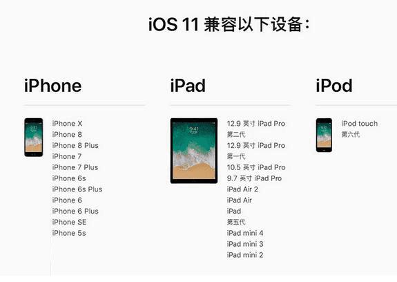 iOS11支持设备包括iPhone X、iPhone8、iPhone8 Plus、iPhone7、iPhone7 Plus、iPhone5s、iPhone SE、iPhone6/Plus、iPhone6s/Plus;9.7英寸iPad、iPad Air、iPad Air 2、iPad Pro(9.7/12.9一二代、10.5英寸)、iPad mini 2、iPad mini 3、iPad mini 4,iPod方面仅有iPod Touch 6一款设备。