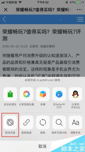 关闭方法小编测试之后有2种方式,一是还是通过右上角的【...】点击进入,会看到【取消浮窗】选项,如下图所示。