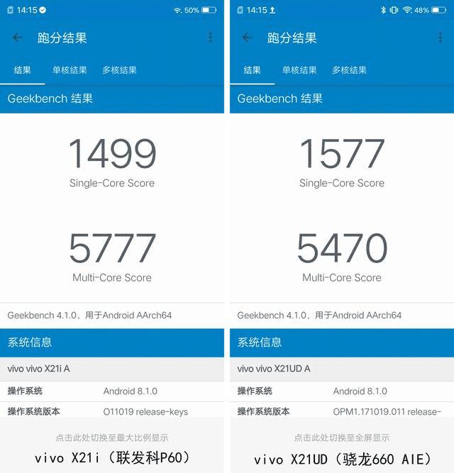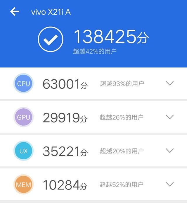 vivo X21i在安兔兔上的跑分成绩为13万+,逼近14万,这样的跑分成绩是非常不错的。尤其是CPU部分,6万+的跑分超过了93%的用户,性能给力。而这样的成绩,与众多骁龙660机型相差并不大。尤其是运行GeekBench 4跑分的时候,你还会发现,联发科P60的1499单核跑分比骁龙660 AIE的1577分略低一点,但其5777多核跑分比骁龙660 AIE的5470多核跑分高上一些。应该说,联发科P60和骁龙660 AIE难分上下。