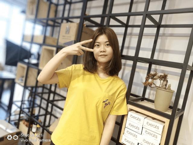 除了逆光人像之外,vivo X21i的人像模式也值得称赞。下面这张照片是在室内拍摄的,光线条件复杂,但拍出来的效果不错。小姐姐楚楚动人,光影自然,而背景虚化效果艺术感十足。
