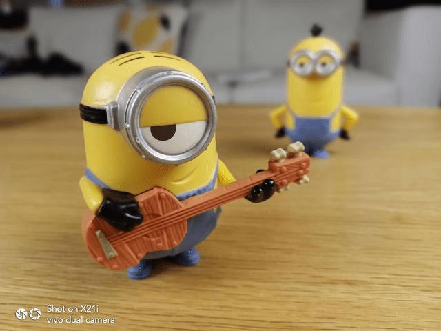 当然,背景虚化拍小物件也是效果不错。下图中,小黄人非常显眼,其弹奏乐器的陶醉表情跃然纸上,趣味盎然而小黄人与吉他的色泽经过优化后,饱和度更高,看起来更加舒服。