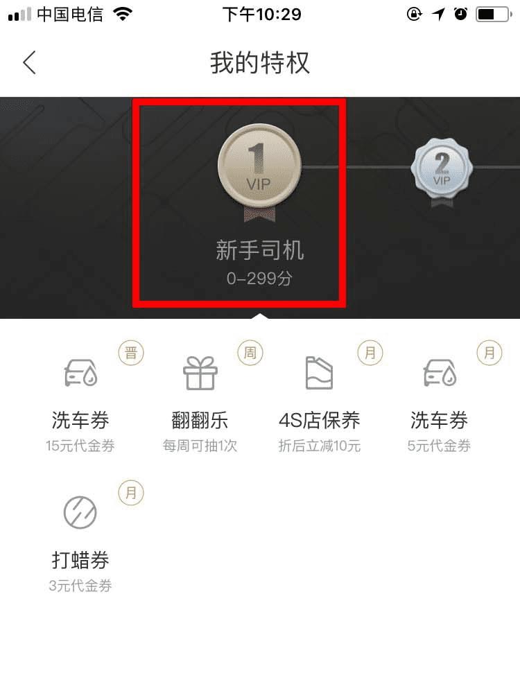 3、在接下来的页面中,用手指滑动左右滑动上半部分可以看到VIP1(新手司机)、VIP2(熟练司机)、VIP3(进阶司机)以及往后各VIP等级所需要的经验以及可以获得的特权。