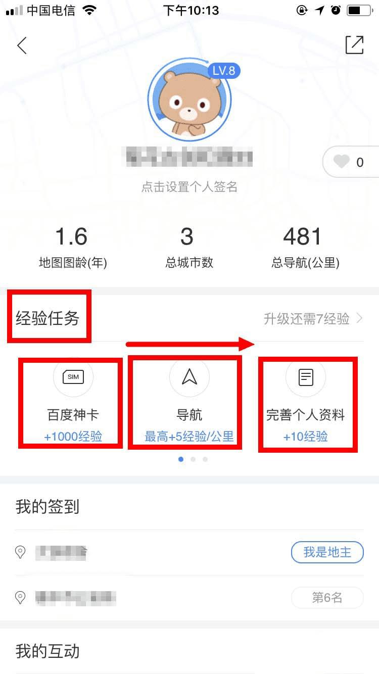 3、进入下图的页面后,便可以看到经验任务。首先,百度神卡、导航、完善个人资料,可以获得相应的经验。
