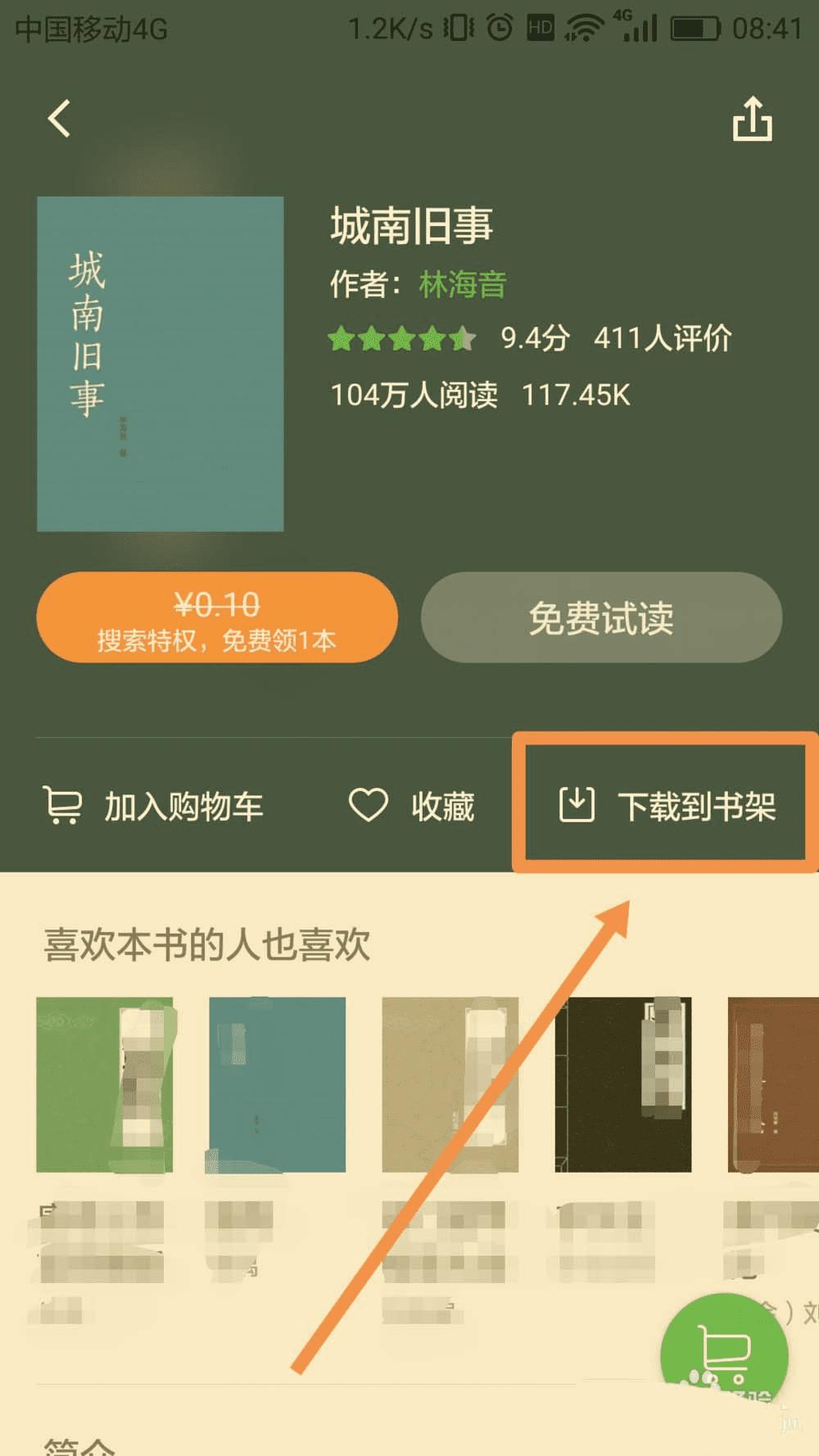 5、进入该图书的详情界面,找到【下载到书架】按钮并点击,如图: