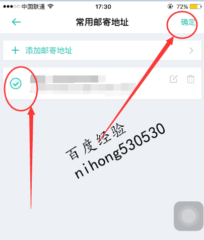 5、保存之后会回到常用的邮寄地址页面,选中需要邮寄的地址,点击右上角的确定。