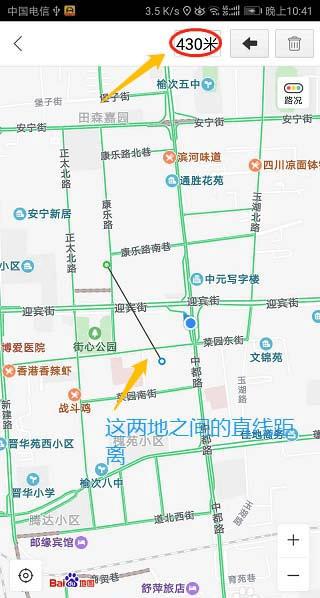 5、点击"测距"以后,在地图里任意选择几个地点,页面最上方就会显示这些地点之间的直线距离;如果测距功能对我们来说比较常用,也可以将其添加到快捷功能里...