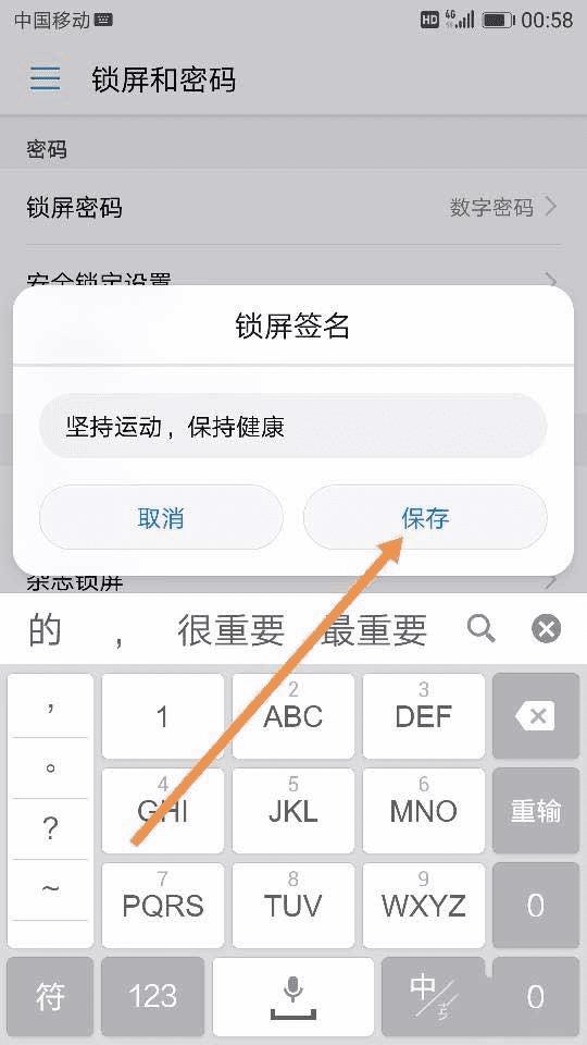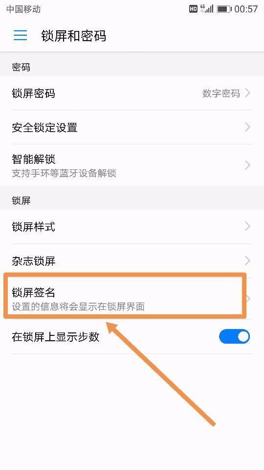 6、其实,我们除了显示刚刚需要显示的步数功能外,我们完全可以在此基础上再添加一些激励自己每天坚持运动的话,那也是一种很不错的小温馨。我们按照刚刚的步骤再次回到之前的设置界面,找到 锁屏签名 这个选项,输入自己想要激励自己的文字,点击保存即可,如图所示~