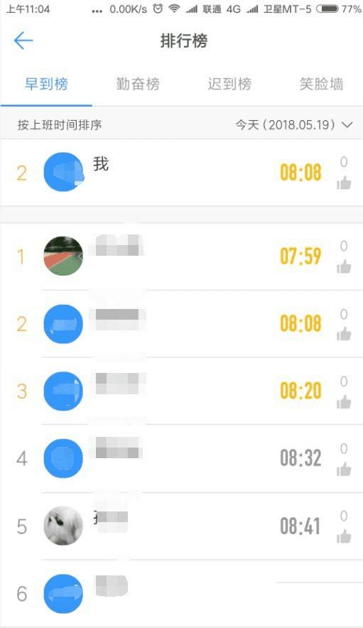 5、点击早到榜,可以看到今天的出勤打卡时间排名。
