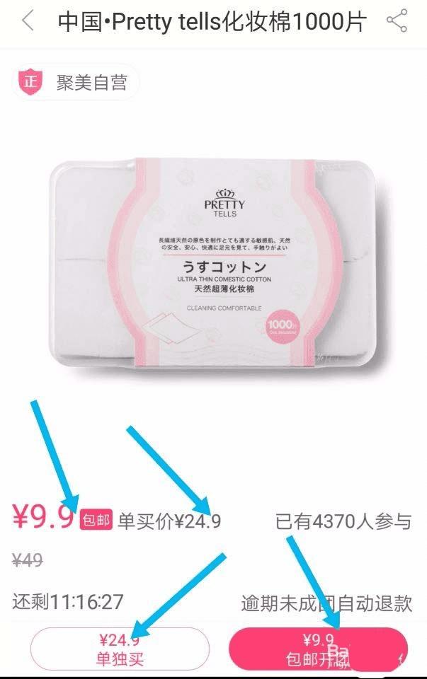 4、比如我们现在看中了这个化妆棉,原价要24.9,现在拼团只需9.9,非常划算,再点下【去开团】。