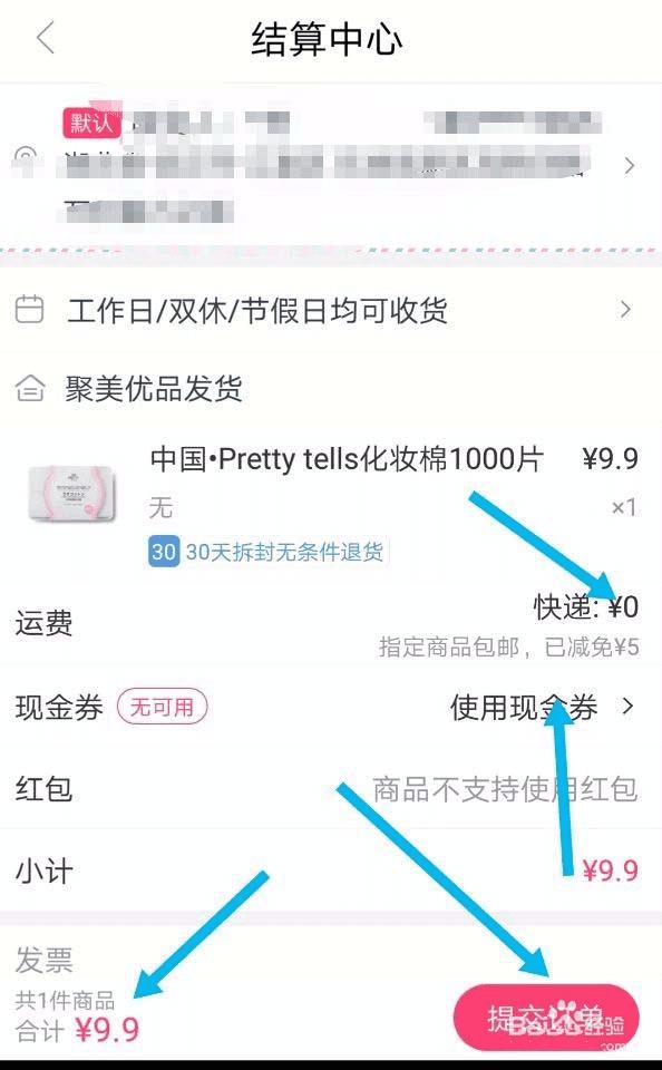 6、就到付款界面,确认一下你的收货地址,和团购的商品。再看一下金额,如果有红包,还可以使用。最后信息确认无误后,就可以【提交订单】。