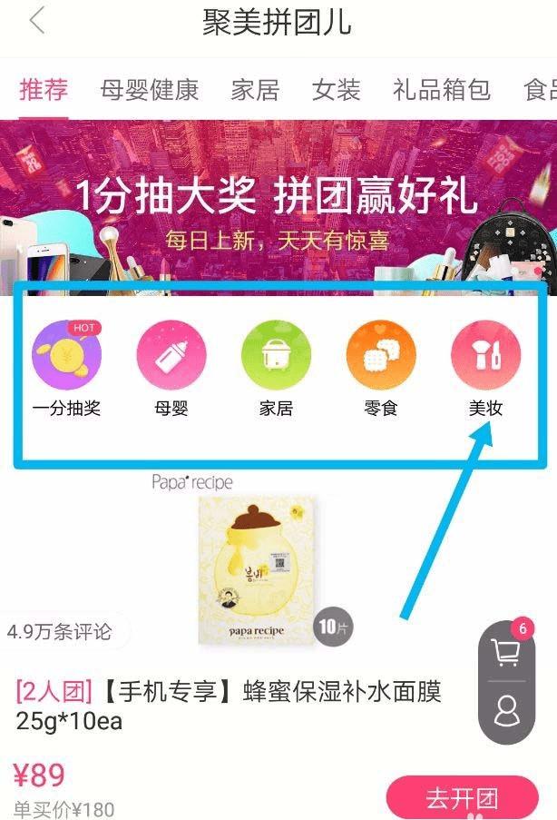 3、进去,就是所有物品的拼团界面了。在这里可以拼团的所有选项,可直接往下面看商品,但是会些杂乱。比如我们现在要看【美妆】,就选择【美妆】,这样出来的就都是化妆品。