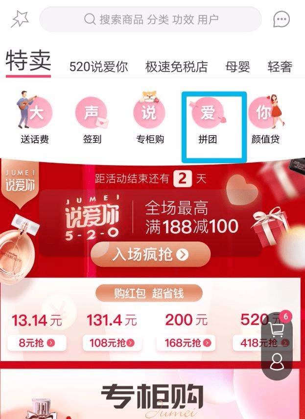 2、进入聚美的首页后,在框框里面找到【拼团】,小编以把它框起来了。