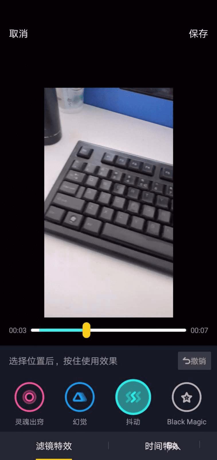 7、在滤镜特效中选择“抖动”,然后拖到视频进度条的位置,选择增加特效的节点,然后长按该特效则会为视频添加“抖动”特效,添加的“抖动”特效进度条会变成与之相同的颜色。