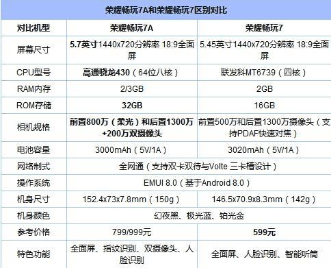 老规矩,首先来看看荣耀畅玩7和7A在价格、配置参数方面的区别,对比如下所示。