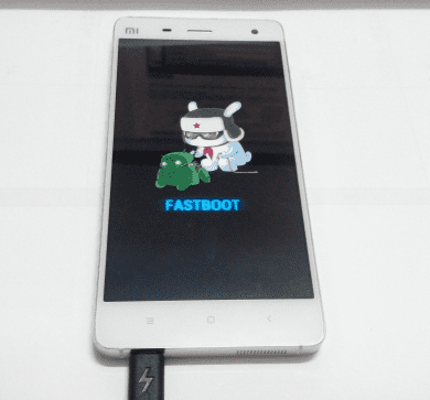 3:接下来手机要进入FastBoot模式,进入的方法:在手机关机状态下,按住音量键-和电源键,当屏幕中出现一只米兔正在修安卓机器人则已经进入FastBoot模式,如下图所示:
