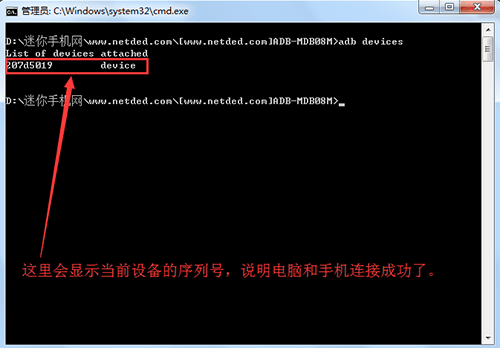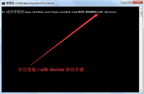5:然后在窗口中 输入: adb devices 然后按回车键,然后会显示你当前设备的序列号:(如图)
