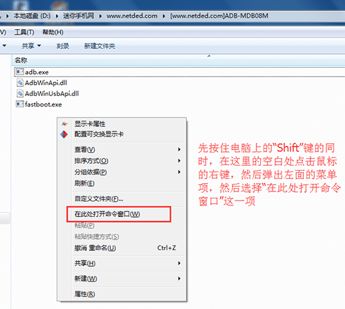 4:然后进入文件夹里,在电脑上按住shift键的同时在文件夹的空白处点击鼠标的右键,在弹出的菜单选项中选择“在此处打开命令窗口”这一项,打开黑色的命令窗口