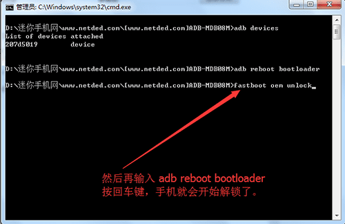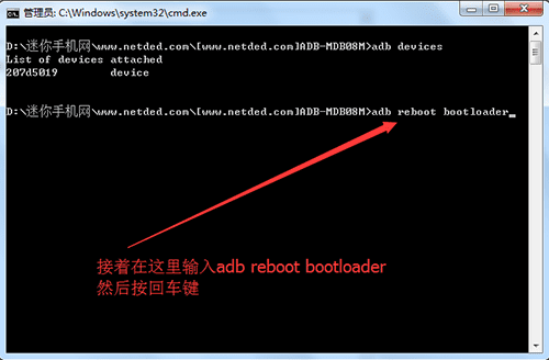 6:接着再输入 adb reboot bootloader 然后按回车键,现在,手机就会自动重启到bootloader模式了