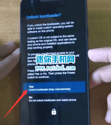 8:这个时候看手机,手机界面上有选择,然后用音量键选为“Yes”,按一下“电源键”确认即可