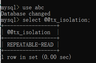 再使用我们之前创建好的数据库:use abc; 并查看当前隔离级别:select @@tx_isolation;